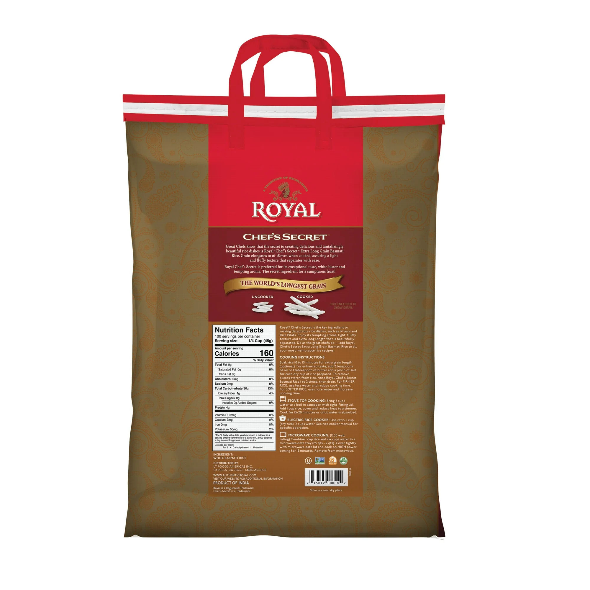 Royal Chef?s Secret Excel Basmati Rice is premium extra-long grain basmati rice, aged to perfection for enhanced aroma and non-sticky texture. Grown in the fertile Himalayan foothills, it?s prized in North Indian and Mughlai cuisines. Naturally low in fat and sodium, it?s ideal for biryanis, pulaos, and special occasion meals.
